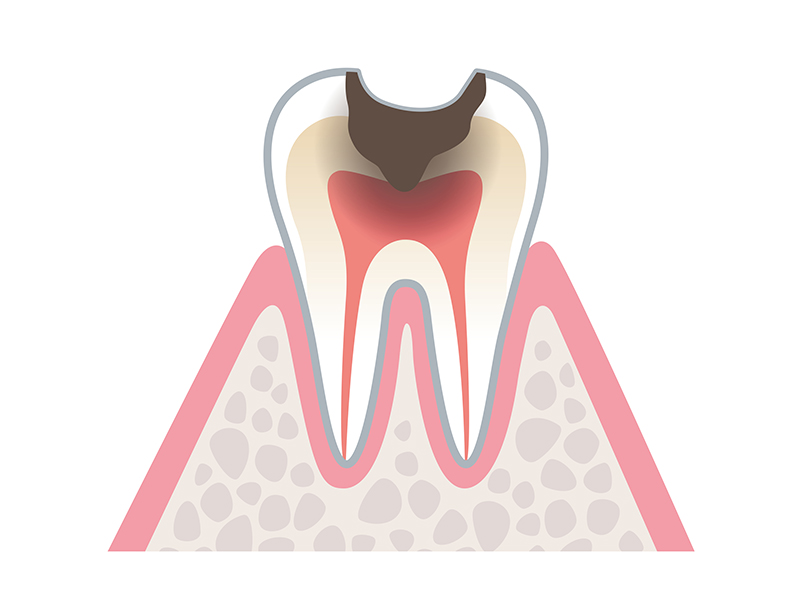 むし歯が象牙質まで到達すると、神経に近い部位まで細菌が侵入します。象牙質は神経との距離が近いため、温度変化などの刺激で痛みを感じやすくなるのが特徴です。この段階では、むし歯を除去し、適切な詰め物や被せ物で歯を保護しなければなりません。症状によっては、神経の除去(抜髄)が必要になるケースもあります。